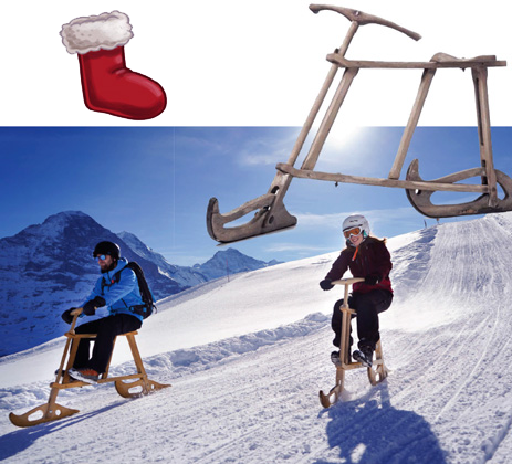 Бицикл за снег има дрвен оквир, две металне шине и управљач спреда. У Оберланду га возе чак и поштари. Од 1995. године у тој области приређује се такмичење, трка за мушкарце и жене, на стази дугачкој 1,7 километара. У овој спортској дисциплини бицикл за снег достиже брзину и до 60 километара на час.