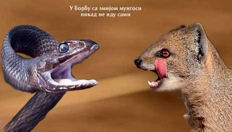 Једну од опасности представљају управо змије отровнице. Чим се нека од њих појави у близини, један мунгос даје знак целој групи да се окупи. Затим је окружују и удруженим снагама нападају са свих страна. Захваљујући брзини и окретности могу да отерају или убију готово сваку змију, без обзира на њену величину. Мунгоси нису имуни на змијски отров, али им густо крзно омогућава бољу заштиту од угриза.