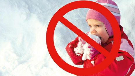 Иако је то многој деци једна од омиљених зимских забава, једење снега или лизање леденица није препоручљиво, и то из неколико разлога. Загађење ваздуха је све веће, нарочито у градовима, па се отровне честице задржавају на свим површинама са којима дођу у додир, укључујући и снег. Чим пахуљице падну, већ може да се каже да су „заражене” бар неким од загађивача. Осим штетних хемијских састојака, као што су угљен-моноксид, бензен, ксилен, у њима има и прашине, честица пепела и друге прљавштине. Многи отрови се не виде голим оком, али то не значи да их нема, чак и на оним местима где бели покривач изгледа беспрекорно чисто. Они који у недостатку воде желе да утоле жеђ снегом, такође треба да буду на опрезу. Његова хладноћа може озбиљно да смањи унутрашњу температуру тела и тако штетно утиче на здравље. Код деце се често јављају упале грла и прехладе.