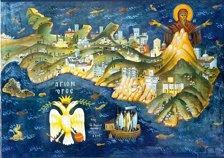 Према предању, Богородица је, путујући бродом на Кипар, због невремена пристала на Атос. Тадашње многобожачко становништво прихватило је њену проповед и поверовало у чуда која је чинила, тако да је она постала заштитница Свете Горе и једина жена којој је било дозвољено да ту крочи.