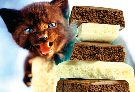 Мачкама никако не треба давати чоколаду какву ми једемо, зато што садржи теобромин, горки алкалоид из какаа, који за мачке може да буде смртоносан. Из истог разлога ни кучићи не смеју да једу чоколаду која није посебно прерађена. Сви знамо да су куце алави сваштоједи и да би појеле све што им падне под њушку, због чега се за њих и праве посебни слаткиши. Зашто се онда нешто слично не ради и за маце? Ма како укусни били, мачке не могу да уживају у слаткишима зато што су услед генског поремећаја одавно изгубиле способност да окусе слатко. Оне ништа осим мрсног и не једу. У поређењу са преосталих 12 копнених врста које се хране месом, мачкке су „супермесождери” – ни једној другој животињи није потребно толико беланчевина да би преживела. Можете маци да понудите најлепши колач на свету, а она ће највероватније само презриво фркнути и окренути главу. Много више ће је обрадовати мало сланинице или комад свеже џигерице.