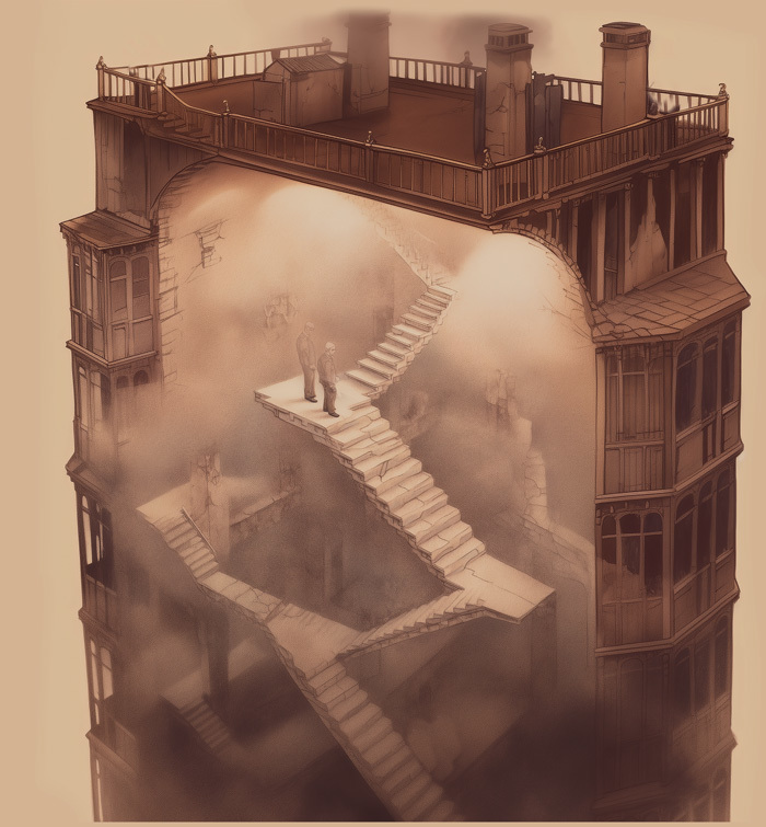 Наставили су. Више није било ознака спратова. Судећи по проређености подрумске мемле, биће да су прилично одмакли. А можда отупела људска чула обмањују, кружење представљају напретком.