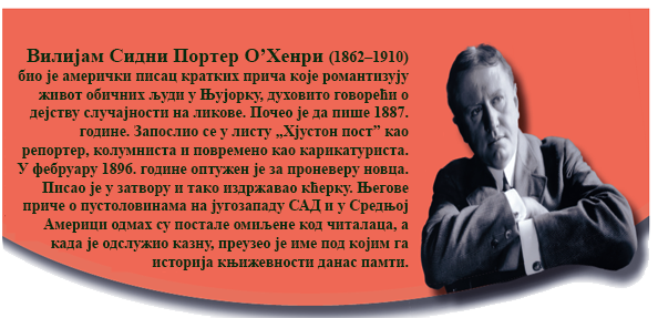 Изгледа да се Џим брзо будио из заноса. Привио је своју Делу уза се. У следећих десет секунди посматрајмо с разборитом пажњом неки безначајан предмет у другом правцу. Осам долара седмично или милион годишње – каква је разлика. Математичар или хумориста дали би вам погрешан одговор. Мудраци су донели вредне дарове, али не једни другима. Ова мрачна изјава биће осветљена касније.