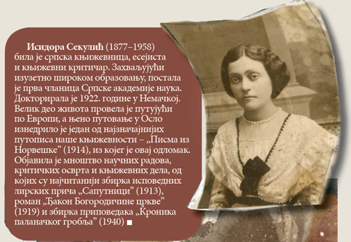 Као што је познато, Норвешка је државица која не игра европску улогу. Не спада ни у један политички савез, нема реч на великим конференцијама, не ратује, не прави дугове, не дели плен, нема чувену војску. Оно чиме се она одликује, то је једна општа култура најсолиднијег квалитета у свима слојевима становништва. А то значи да се у Норвешкој много већа брига поклања народу него држави. Код нас се сматра да од државе долази углед народу; а тамо горе на северу мисли се обратно.